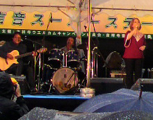 先日5月初旬に吉祥寺で行われた吉祥寺音楽祭を見物に行ってきました。僕らが行った日は生憎の雨にも関わらず、傘を差しながら見物しているお客さんが多かったのが印象的でした。写真はヴィウマさんとホブソン氏によるブラジリアンユニット「デュオ・フィーノ」です。今回はいつものデュオスタイルではなく、ドラムがいる編成でボサノバのスタンダードを中心に演奏をしていました。天気の良い日はもちろんですが、雨の日に聴くボサノバもまた違った趣があってとても素敵です。