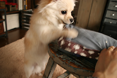 知らなかったのですが、犬は(猫もかも)枕をするのが好きなようです。 ![]() ■ 約 20cm のおゆまくら 中には綿を詰めたクッション状のものと カバーは別に作りました。 ![]() ■ ハンドステッチ どうせお部屋に置くなら、と細部にコダワリ。 ![]() ■ さぁ お使いなさい あらあらおゆ、さっそくお気に入りのようね~ ![]() えい ![]() やあ ![]() どりゃ~ あらあらおゆ、さっそくお気に入り・・・ ておい!! ![]() ■ この世に生を享けてから5分後 おゆが使う枕だし柔らかいスムース生地で作ってあげよう、 そう思って作ったのが裏目に。 柔らかな布を牙が貫き、数箇所に穴が開き、縫い目は裂け。。。 ![]() ■ 悲しい記念撮影を見守るおゆ こうなる事を予測して作るべきだったよ、私が悪いの。 おゆは悪くないよ。 ![]() ■ 追い討ちをかけるおゆ おゆ枕1号は失敗に終わり、新たなる使い道を模索中。 2号製作への意欲の方は未だ沸いておりません。 |