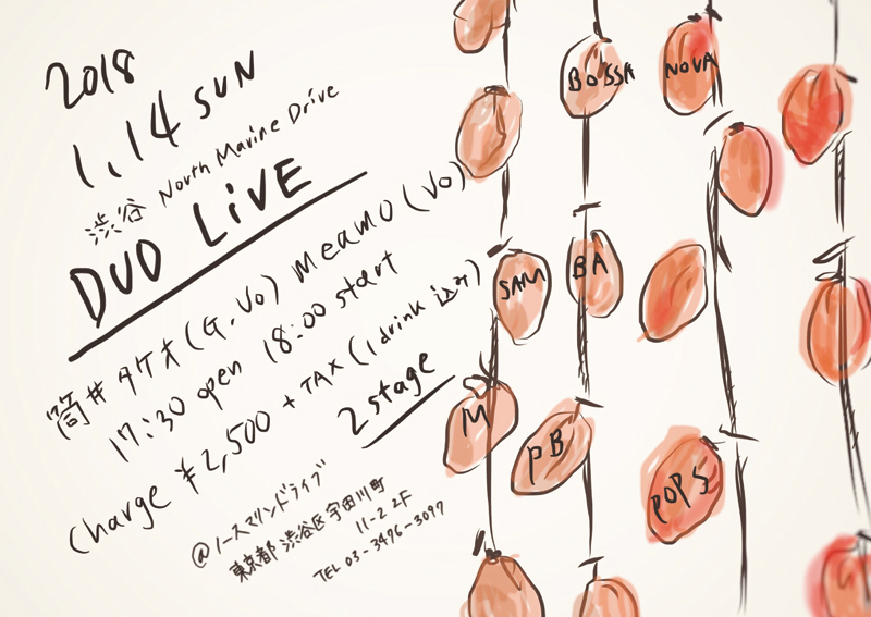 ご好評をいただいております筒井タケオさんとのデュオライブ、今回は日曜の夕方を少しまわった18時からスタートです。